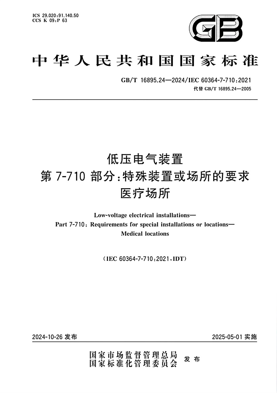日前,由“昆明市院”參與編寫,國家市場監(jiān)督管理總局、國家標準化管理委員會發(fā)布的中華人民共和國國家標準《低壓電氣裝置第7-710部分:特殊裝置或場所的要求醫(yī)療場所(GB/T 16895.24-2024/IEC 60364-7-710:2021 代替GB/T 16895.24-2005)》,已于2025年5月1日起正式實施。加上2023年9月7日已經(jīng)實施的中華人民共和國國家標準《低壓電氣裝置第8-1部分:功能方面 能源效率(GB/T 16895.35-2023/IEC 60364-8-1:2019)》,“昆明市院”參編的兩項電氣專業(yè)國家標準均已獲得了實施。
